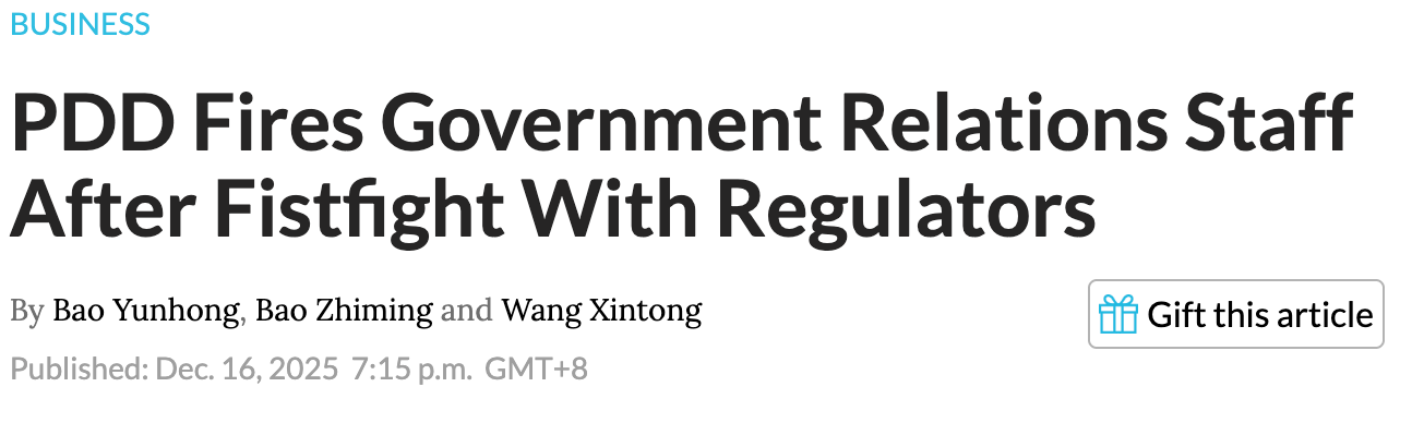 Now, why do I say “again”? In case you missed it, back in early December 2025, it was widely reported that PDD executives and officials from the State Administration for Market Regulation (SAMR) got into a fistfight on Dec 3rd. Almost immediately, reports and social media posts mentioning the incident were scrubbed from China’s internet.