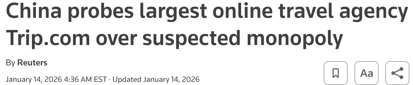 On January 14, 2026, the Chinese government officially launched an antitrust investigation into Trip.com. It’s reported that the State Administration for Market Regulation (SAMR) have already stationed personnel at the company’s headquarter in Shanghai. Staff have been asked to surrender their computers and mobile phones and cooperate with the investigation.