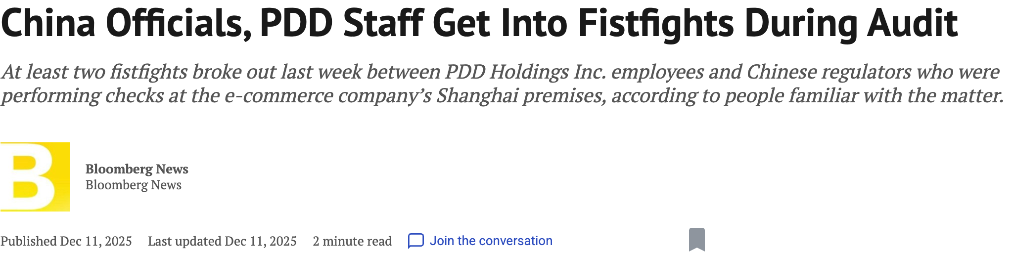 Dec 3rd 2025. SAMR officials arrived at PDD’s Shanghai headquarters for a 3–4 day on-site inspection. It’s not clear what the investigation was focused on, as different reports cited different issues—ranging from food safety to fake orders.